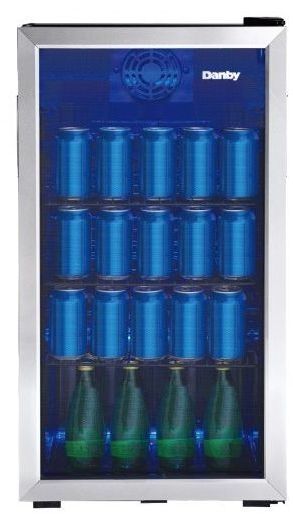 Danby DBC117A1BSSDB-6 freestanding beverage fridge is a 3.1 cu ft. mini fridge, designed to store beer, pop and a variety of other drinks. This unit is a convenient yet modern option for anyone looking to enhance their hosting space. Whether you're updating your wet-bar or adding extra drink storage to your basement, this Danby beverage cooler offers compact versatility with its adjustable wired shelves and blue LED lights. The smooth back design allows for flush installation near a wall, and the reversible door hinge allows you to adjust for either left or right-handed door opening. Additionally, this unit features an easy to use mechanical thermostat, with a temperature range of -2 to 10 C (35.6F 50F). With its sharp clean lines, this mini bar fridge is designed to blend with any decor style seamlessly.